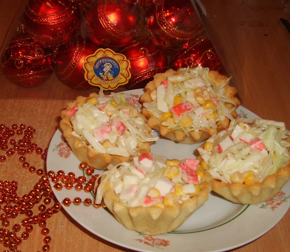 Подавать салат эффектнее в тарталетках.