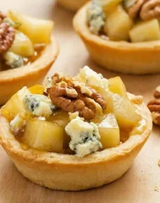 На готовые тарталетки выложите кусочки сочной груши, сыр ДорБлю и грецкий орех. Добавьте пару капель мёда.