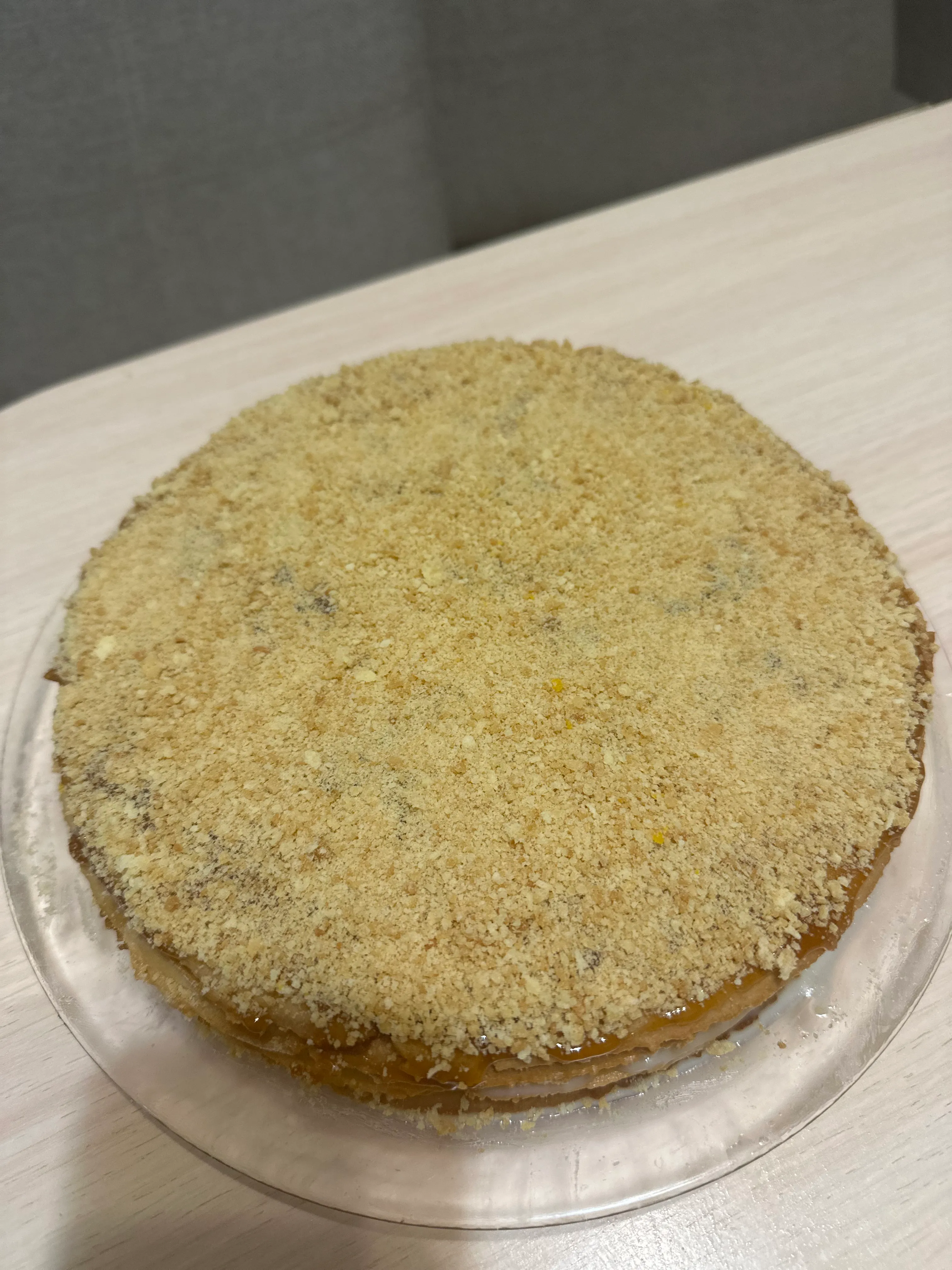После сборки торта, последний слой из обрезков измельчите руками или любым другим способом, посыпьте торт сверху. Дайте пропитаться в холодильнике не менее 2 часов. Приятного аппетита!