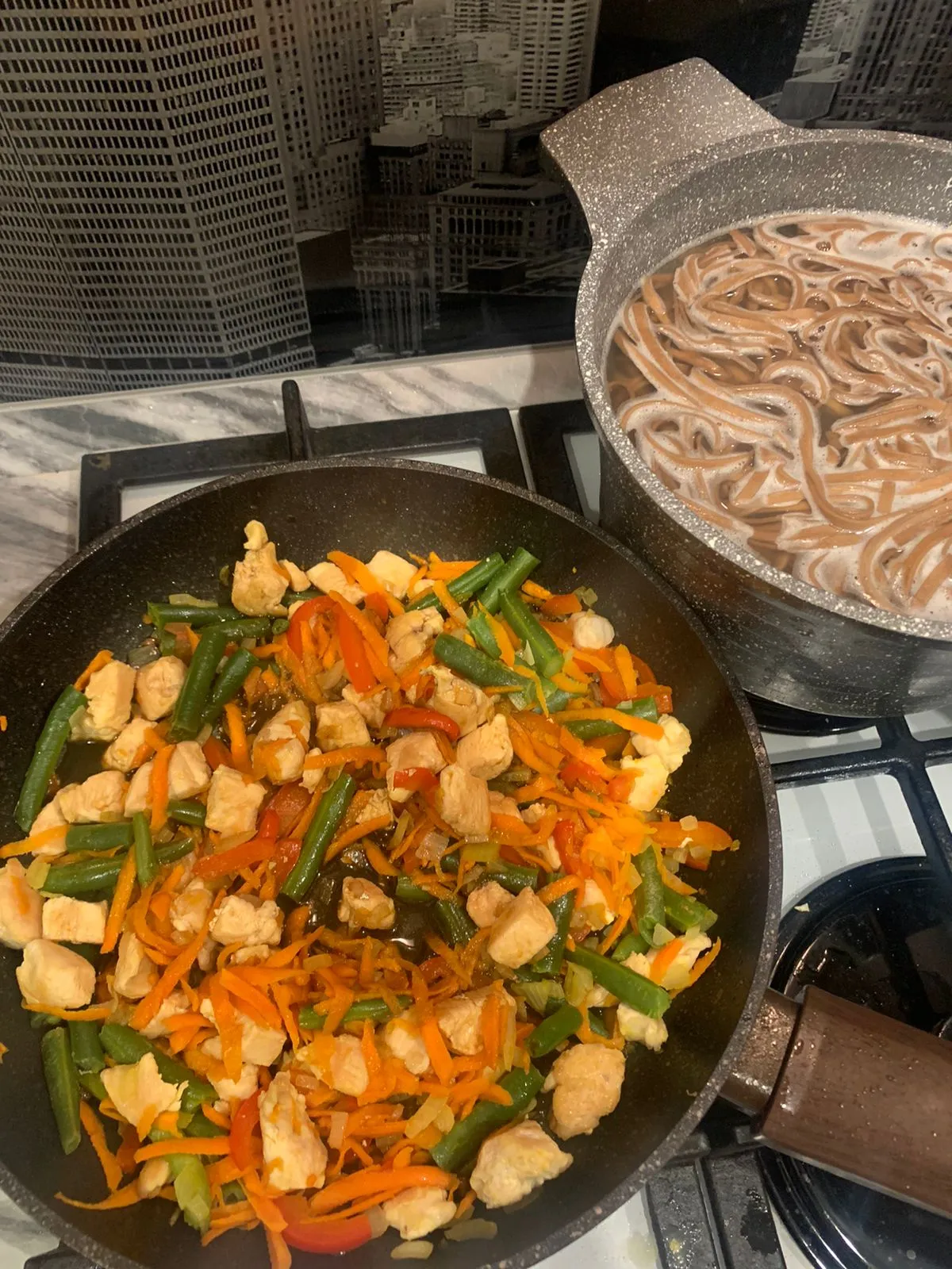 Вскипятите воду для гречневой лапши и приготовьте её по инструкции на упаковке.