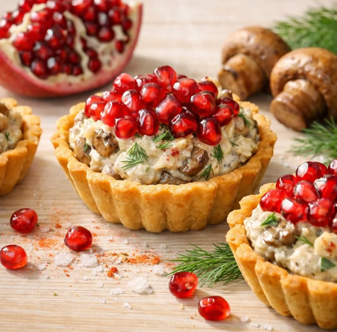 Выложите приготовленную смесь грибов и сыра в тарталетки. Украсьте сверху зёрнами граната.