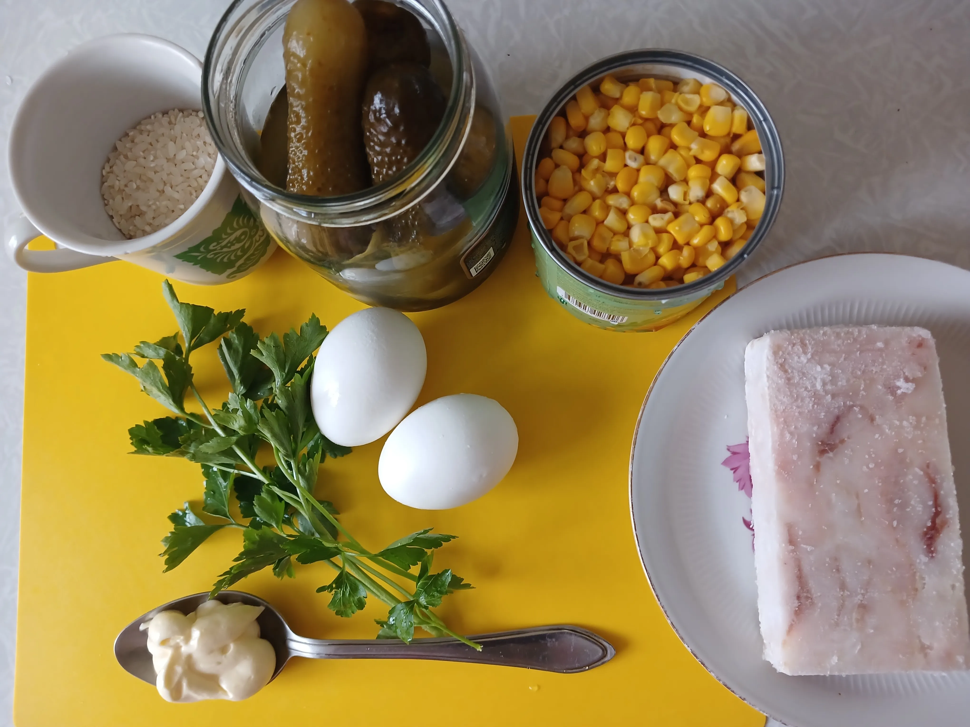 Соедините ингредиенты салата: филе минтая, яйца, огурцы, рис, кукурузу и майонез. Перемешайте. Подавайте порциями, украсив зеленью петрушки.