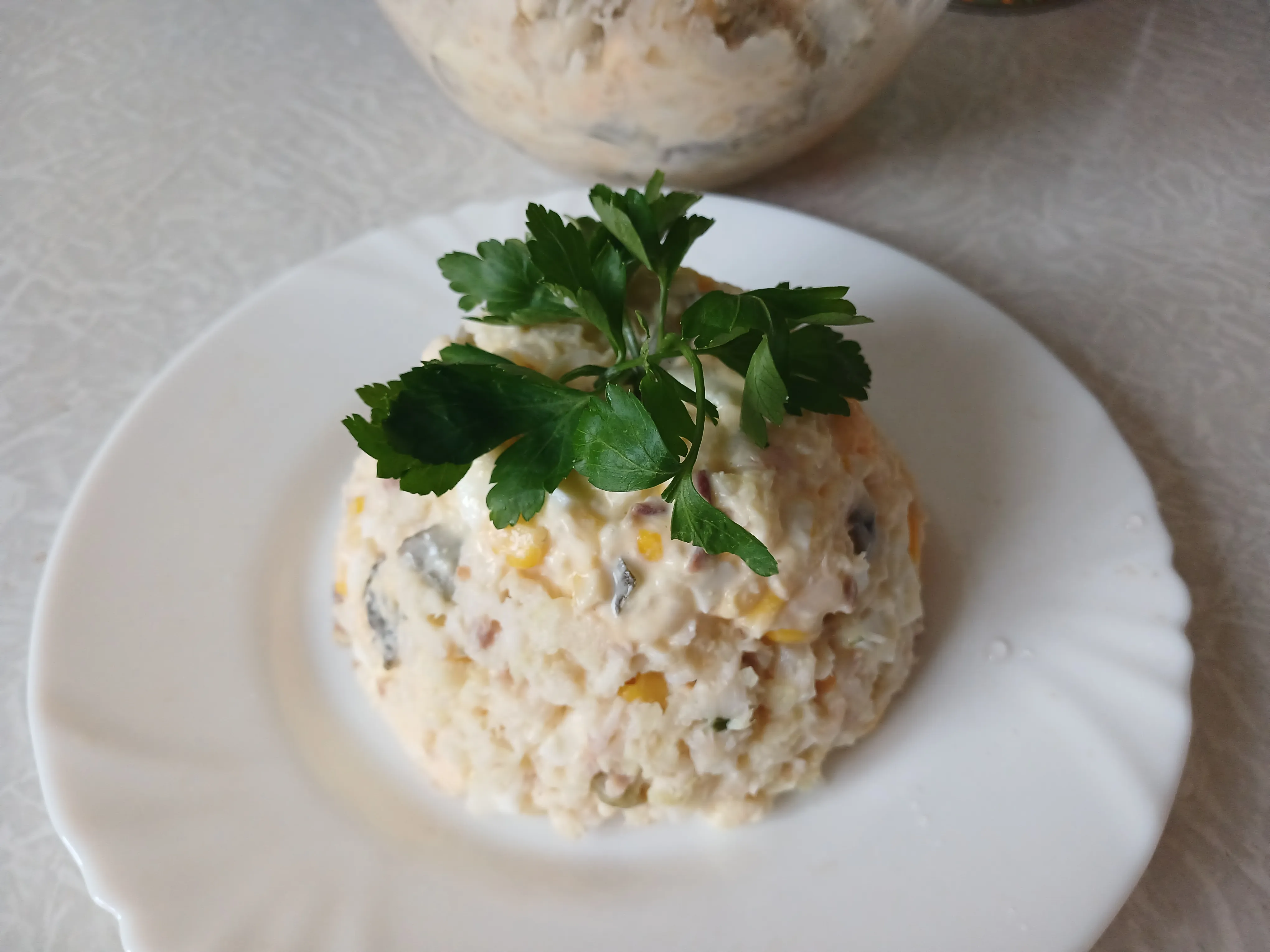 Это универсальный салат: он уместен и на праздничном столе, и в повседневном меню. Минтай здесь играет главную роль, но не доминирует, а мягко сочетается с другими ингредиентами. Вкус получается ровным, сбалансированным и очень домашним.