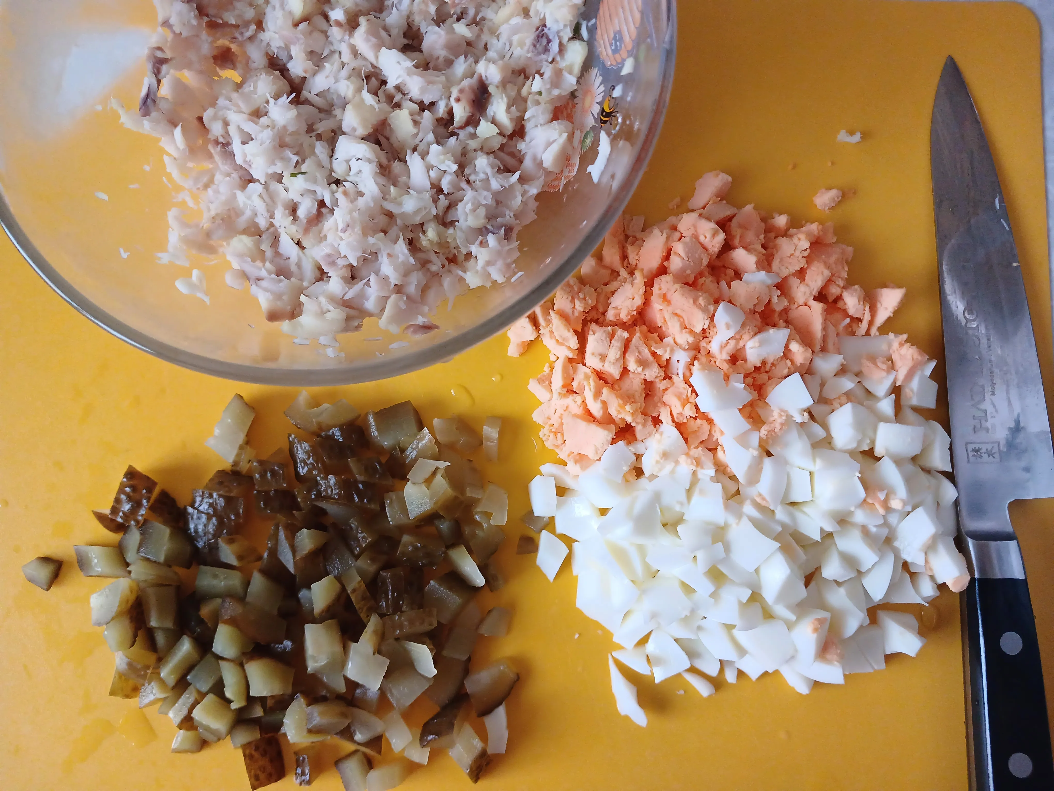 Отварное филе минтая измельчите. Огурцы и яйца нарежьте кубиком.