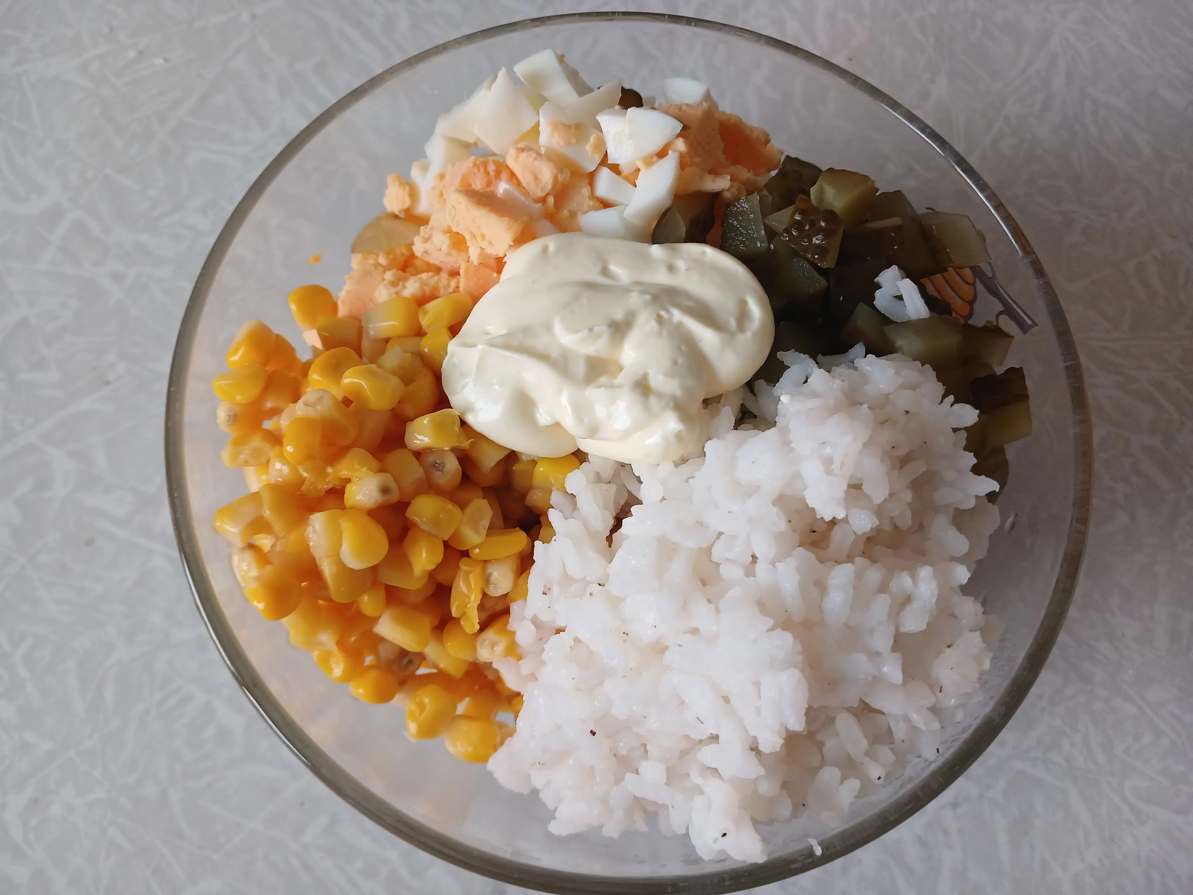 Остужайте все ингредиенты перед смешиванием, особенно рыбу и рис. Так салат будет более аккуратным по текстуре и не «поплывёт». Добавляйте майонез постепенно, чтобы легко контролировать сочность и не перебить нежный вкус минтая.