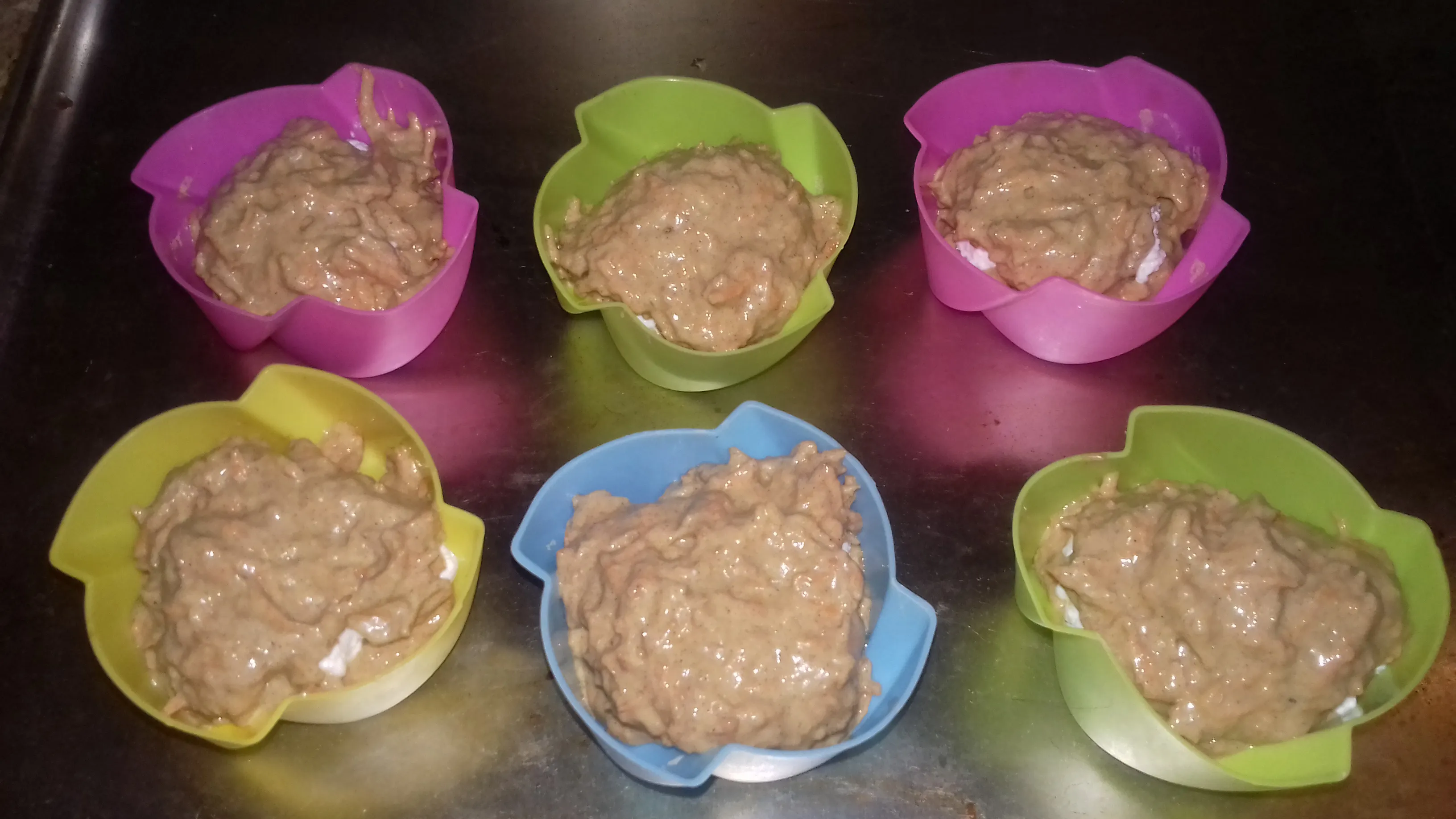 Сверху закройте творожную начинку морковным тестом (ещё по 1 чайной ложке положите в каждую формочку).