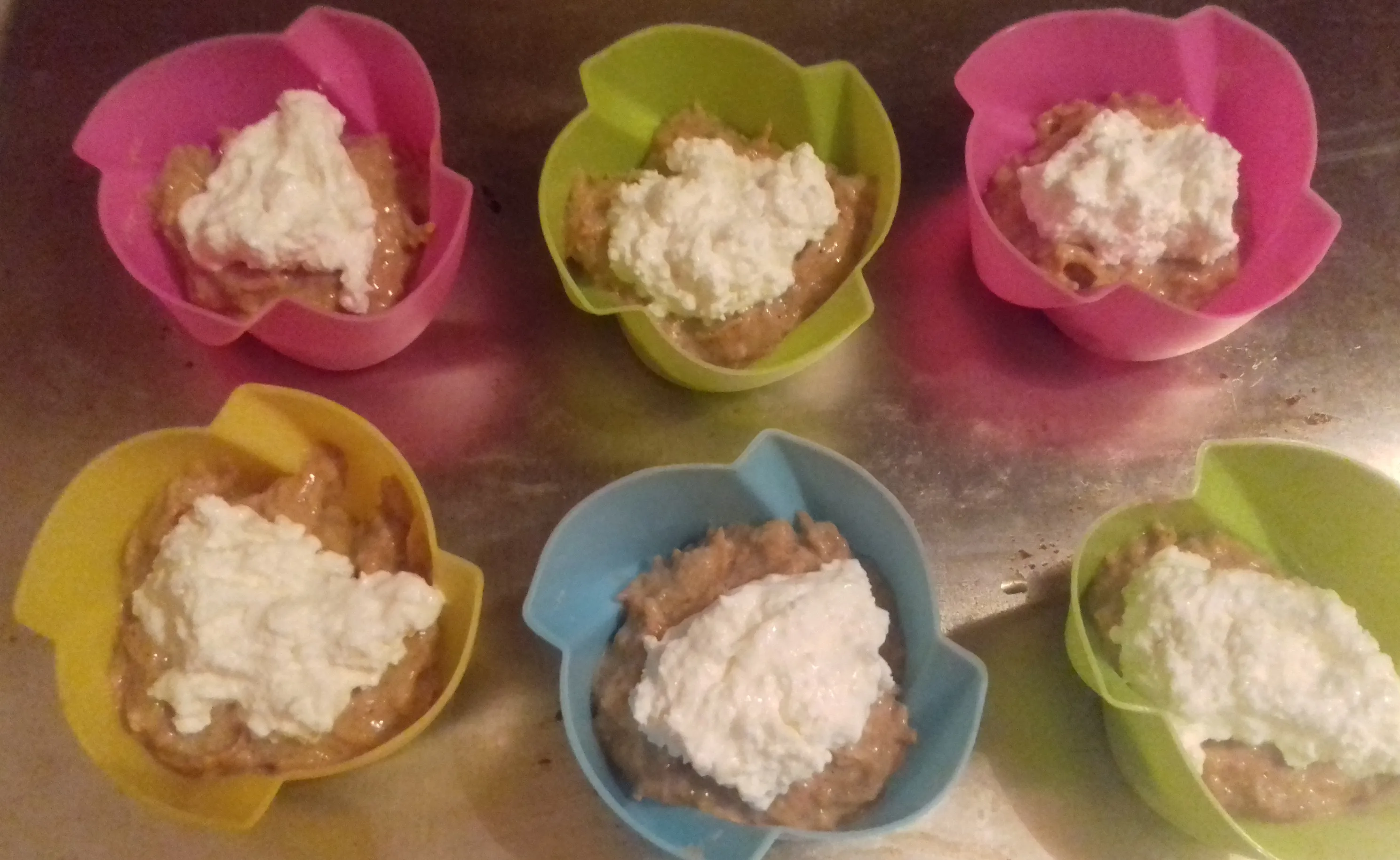 В формочки для кексов выложите по 1 чайной ложке морковного теста. В центр каждой формочки положите по чайной ложке творожной массы.