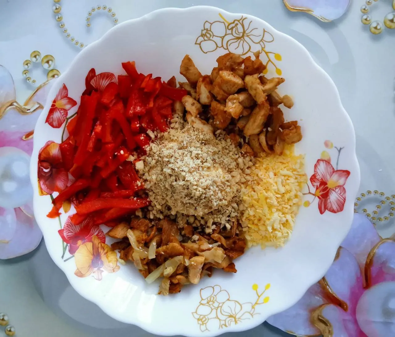 Грибы обжарьте с луком. Перец болгарский нарежьте соломкой. Грецкий орех измельчите. Сыр твёрдый натрите на тёрке. Яйцо куриное измельчите, белок оставьте на украшение.