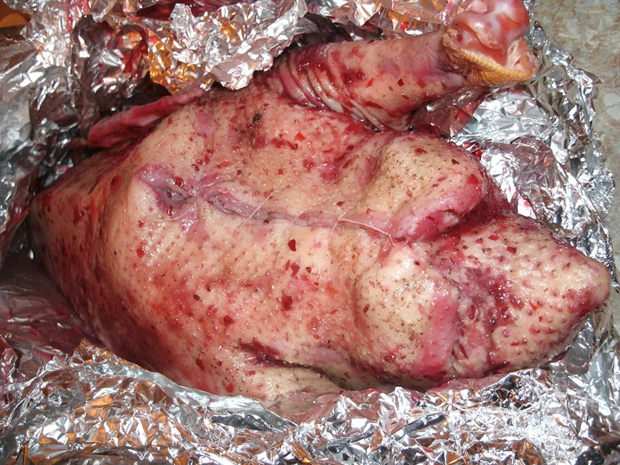 Гуся подготовьте заранее: срежьте лишний жир, опалите тушку.