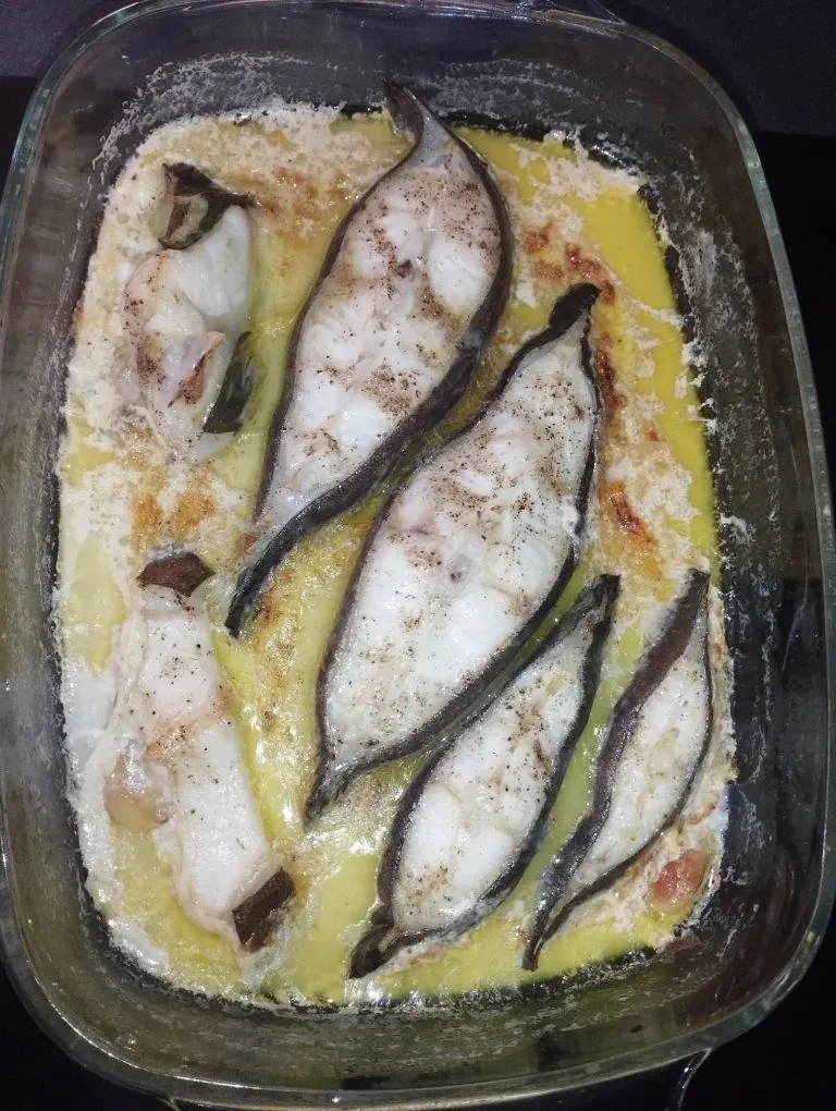 В ёмкость для жарки выложите стейки зубатки, посолите, поперчите, добавьте чеснок и сливки.