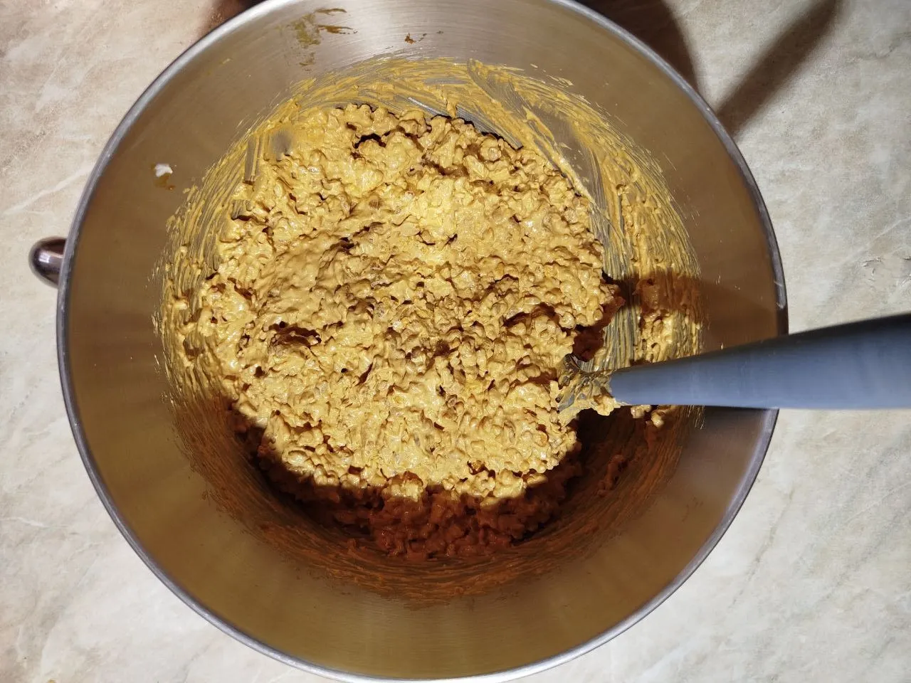 Когда крем будет готов, всыпьте песочную крошку с арахисом и перемешайте до объединения.