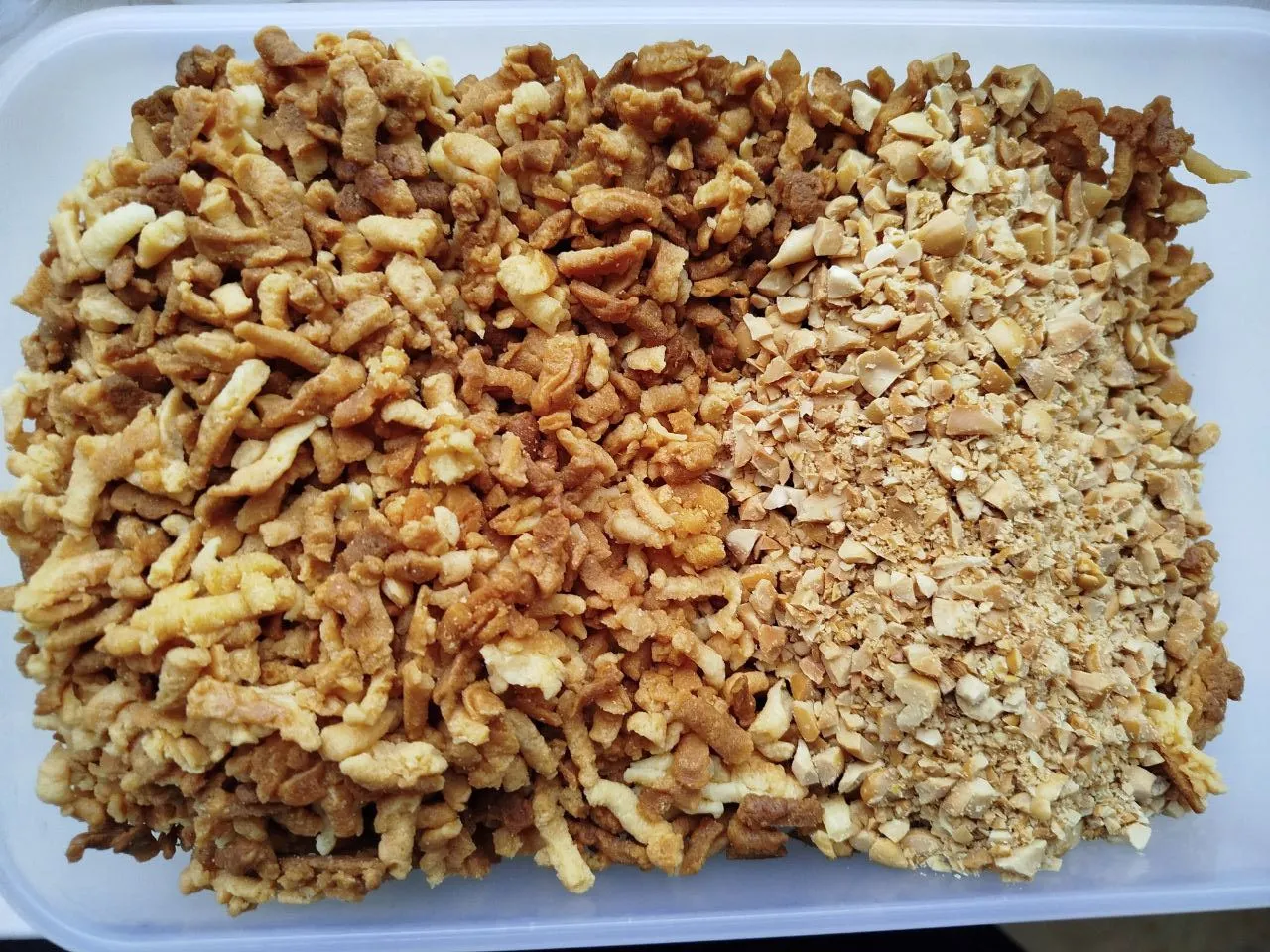 Остывшую песочную крошку и арахис можно соединить в одной ёмкости. Дополнительно ломать песочное печенье не нужно, оно получается хрупкое и самостоятельно приобретает нужный размер при перемешивании.