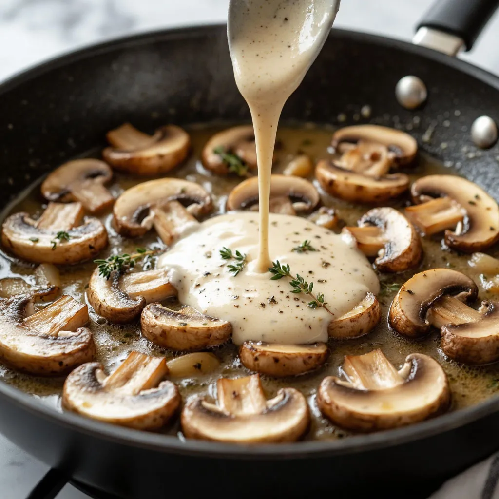На той же сковороде обжарьте шампиньоны до испарения жидкости. Добавьте оставшийся чеснок и тимьян, обжарьте 1 минуту. Влейте сливки, посолите, поперчите, доведите до лёгкого кипения.