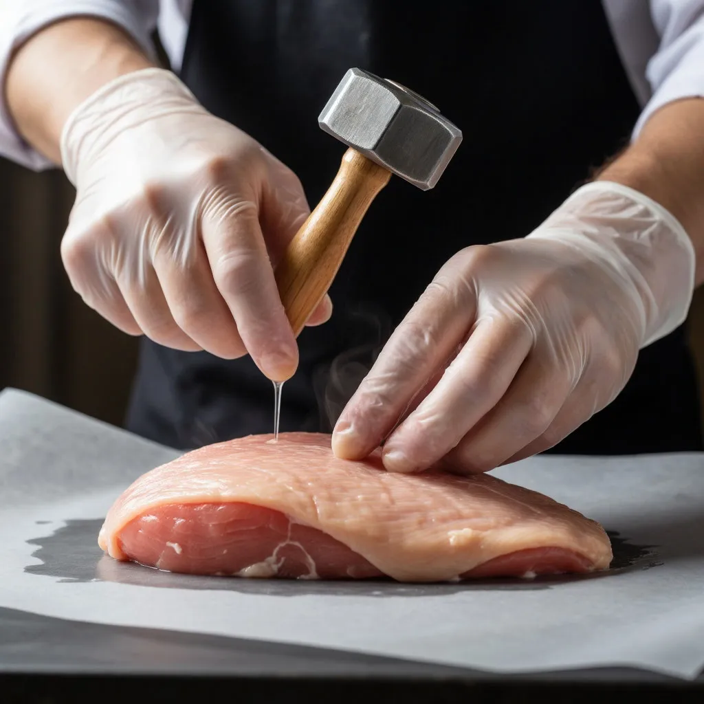 Каждый кусок филе накройте плёнкой и аккуратно отбейте до толщины ~3 мм. Посолите и поперчите с обеих сторон.