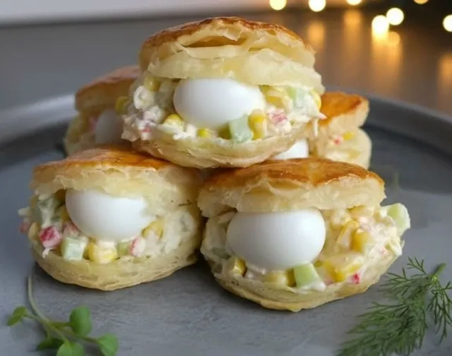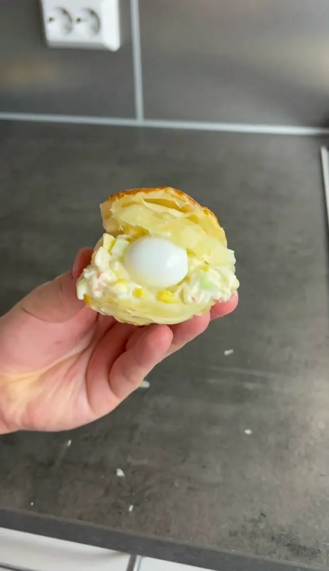 Остывшую «ракушку» надрежьте сбоку, внутрь выложите салат, а в центр — варëное перепелиное яйцо (жемчужину).