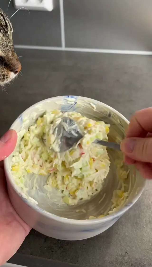 Для начинки мелко нарежьте крабовые палочки и огурец, смешайте с кукурузой и заправьте майонезом со специями.