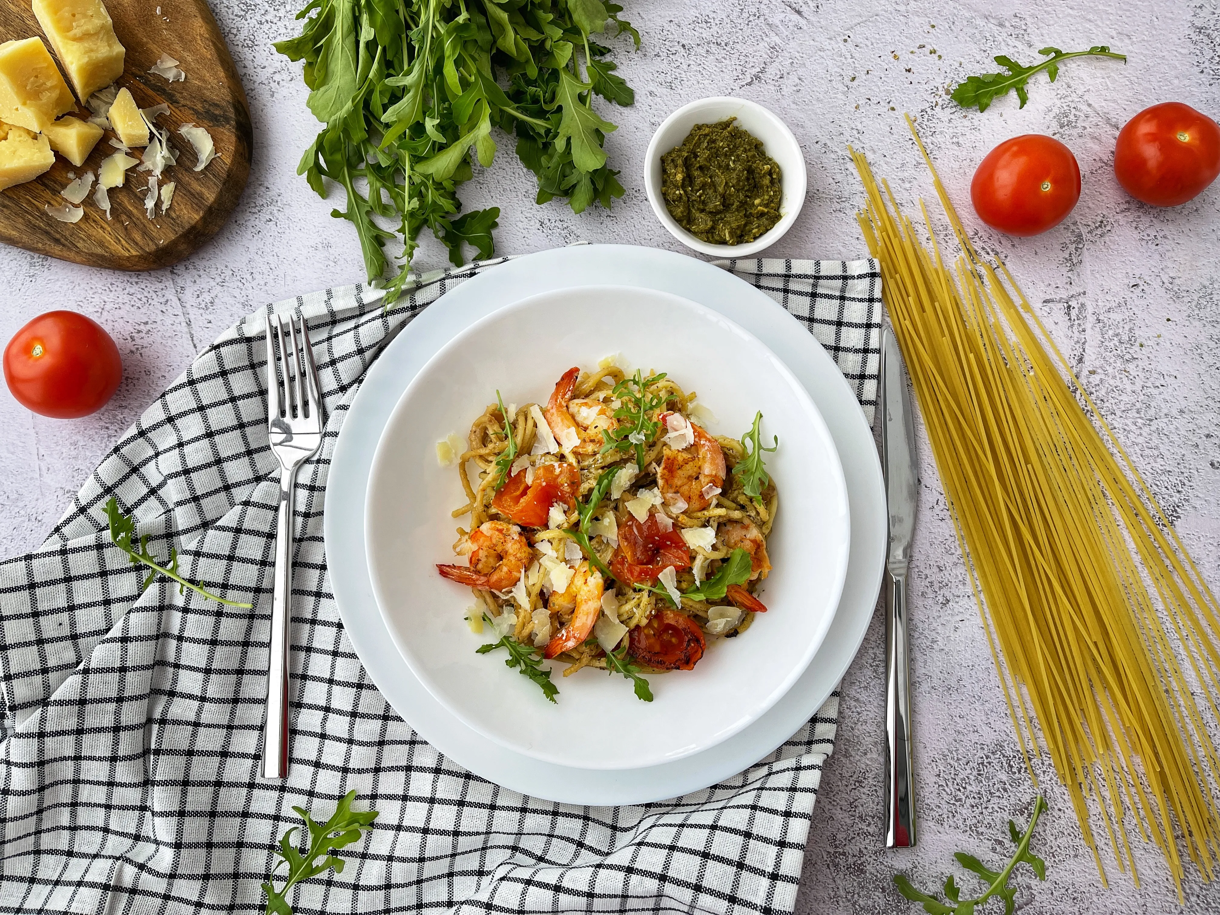 Соедините с пастой креветки с черри. Добавьте руколу и посыпьте сыром Пармезан. Быстрое праздничное блюдо готово.