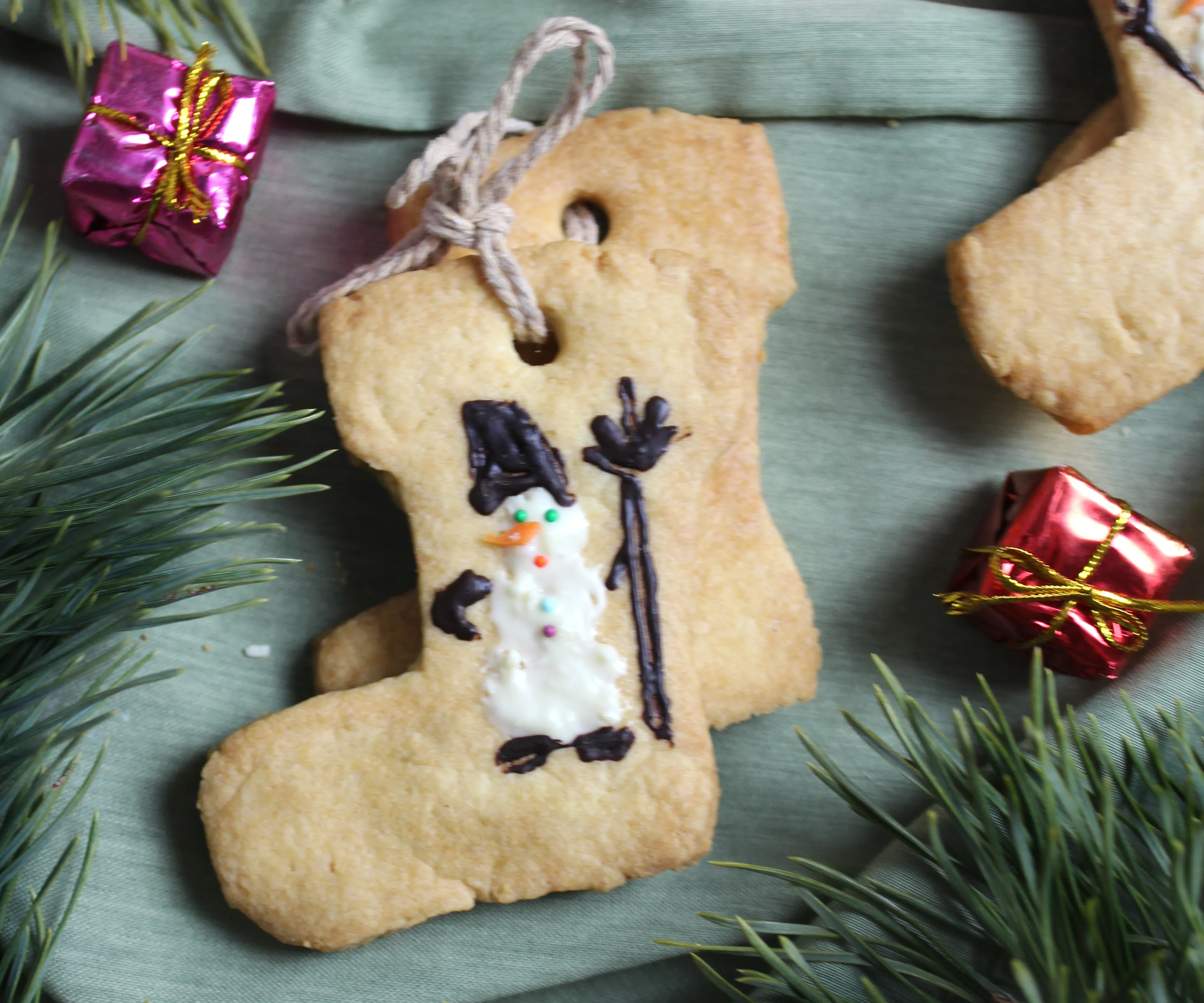 Используя шоколад и разноцветную кондитерскую посыпку, нарисуйте «снеговиков» на «валенках».