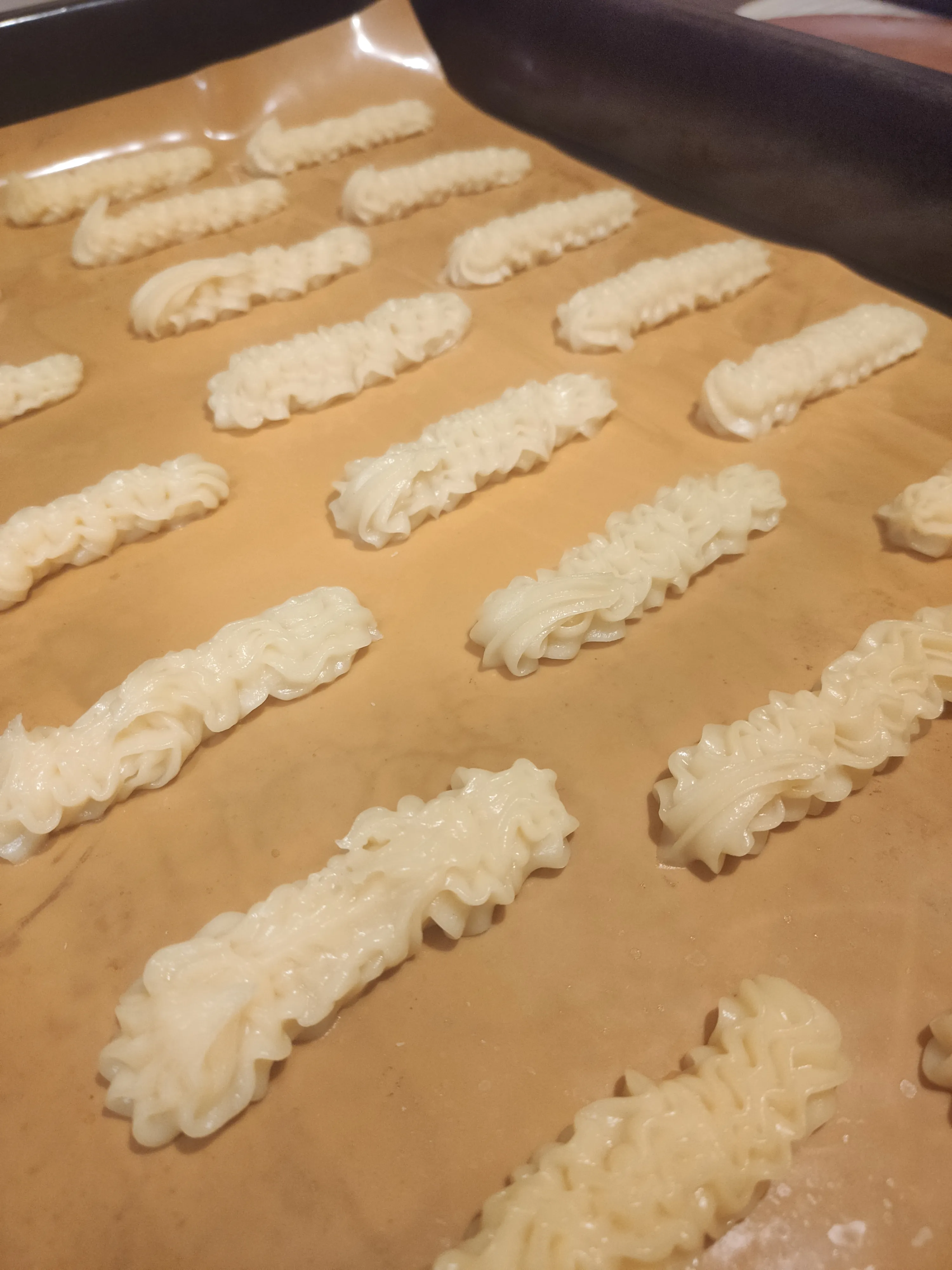 С помощью кулинарного мешка и подходящей насадки отсадите эклеры на коврик. Получается примерно 2 противня.