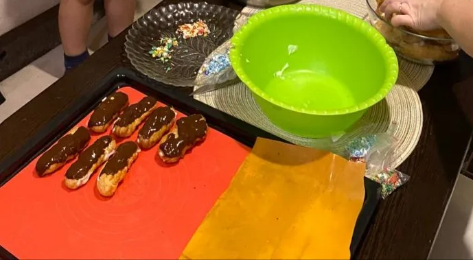Поставьте в разогретую до 190°С духовку на 30 минут, пока эклеры не станут золотистыми. Остудите. Можно использовать готовый заварной крем и глазурь из какао.
