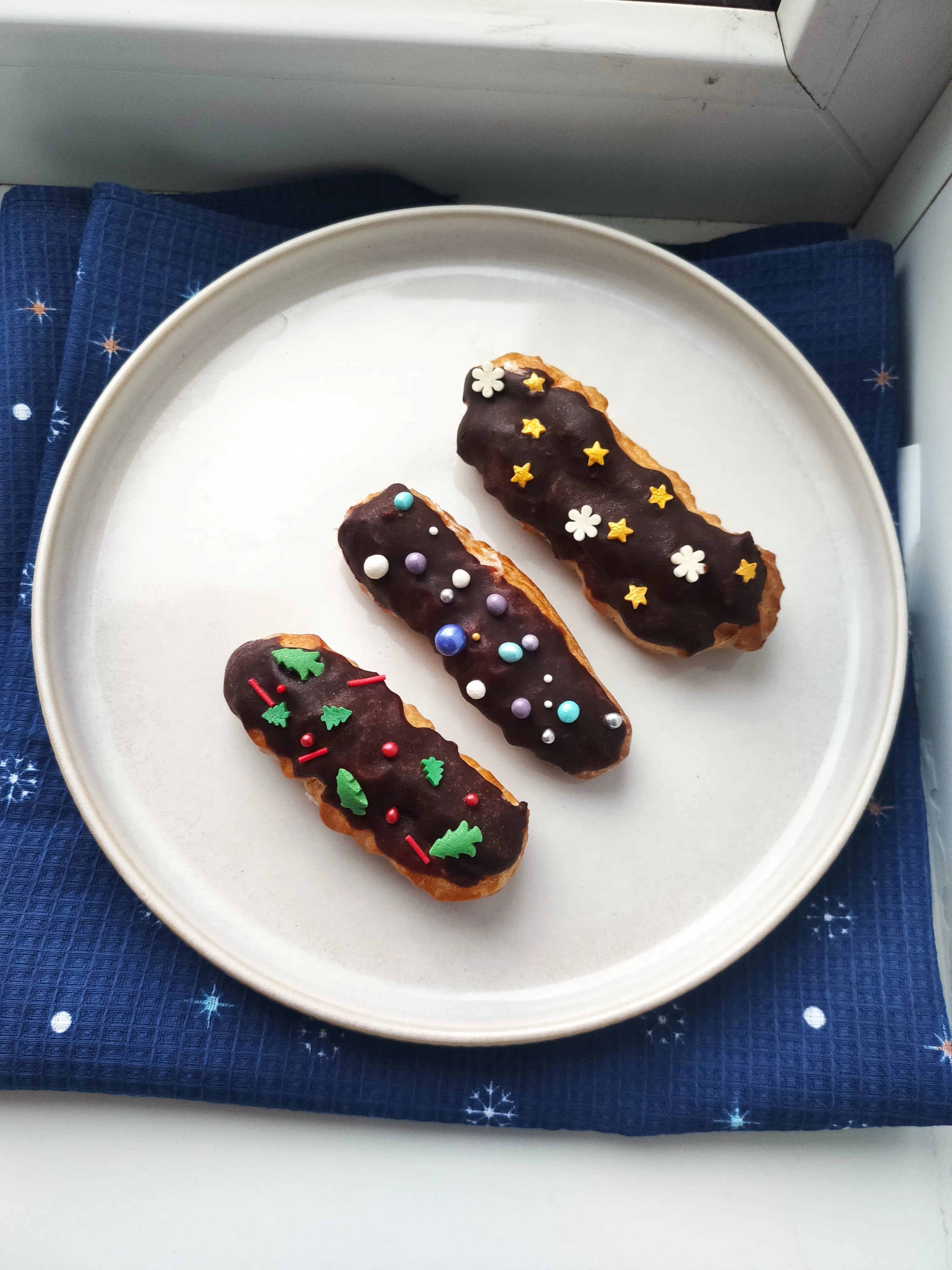 Рецепт эклеров классический, украшение может быть по вашему выбору. Отлично подойдут для праздничного стола!