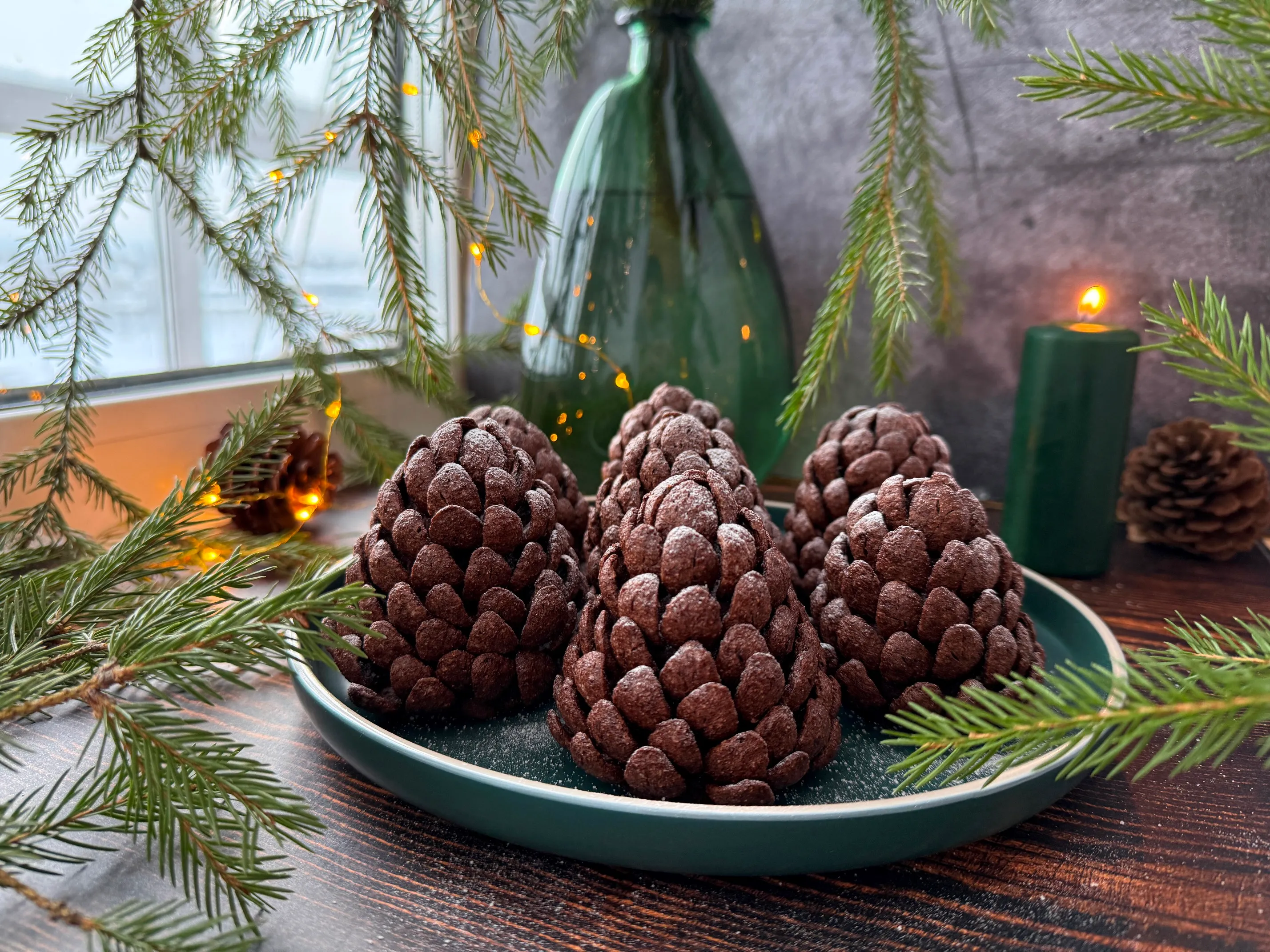 В конусы, начиная с верху, вставьте шоколадные кукурузные хлопья, формируя шишки. Украсьте сахарной пудрой.