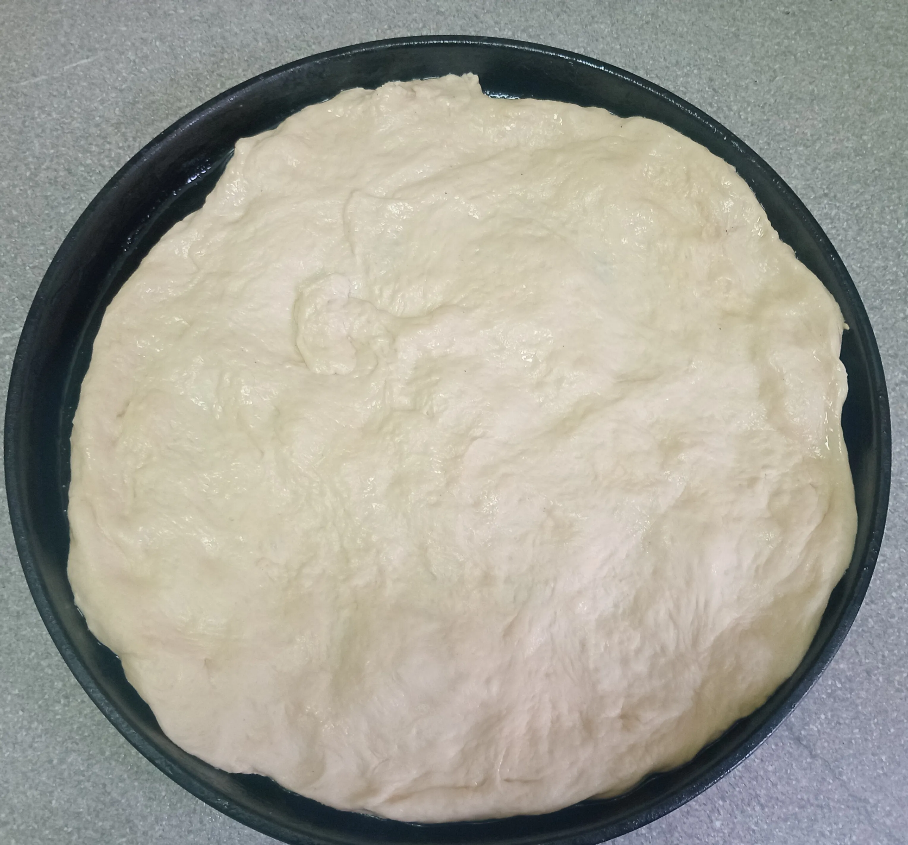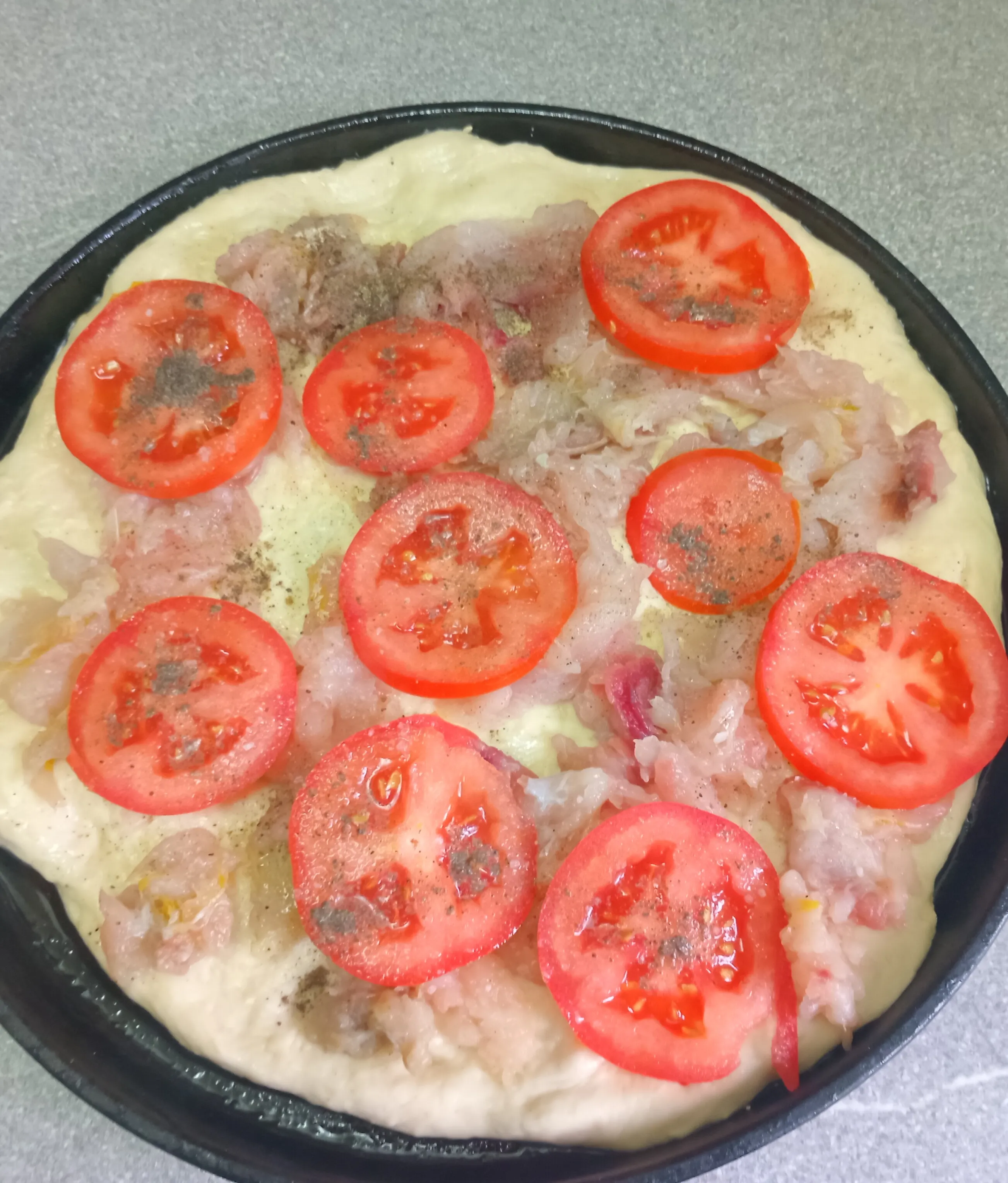 Тесто для пиццы тонко раскатайте и выложите в смазанную растительным маслом форму.