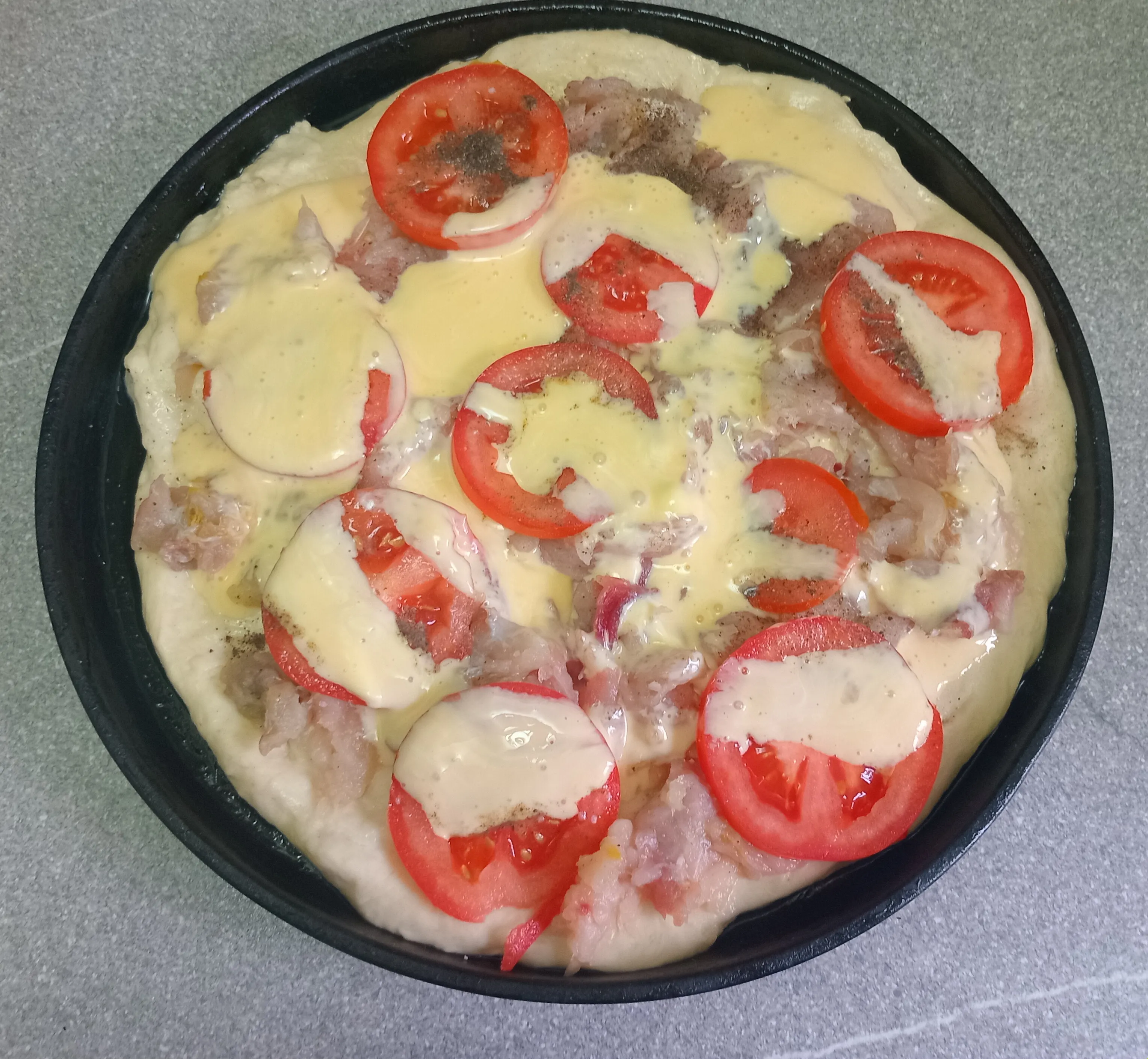 Смешайте яйцо и майонез. Полейте получившейся смесью пиццу.