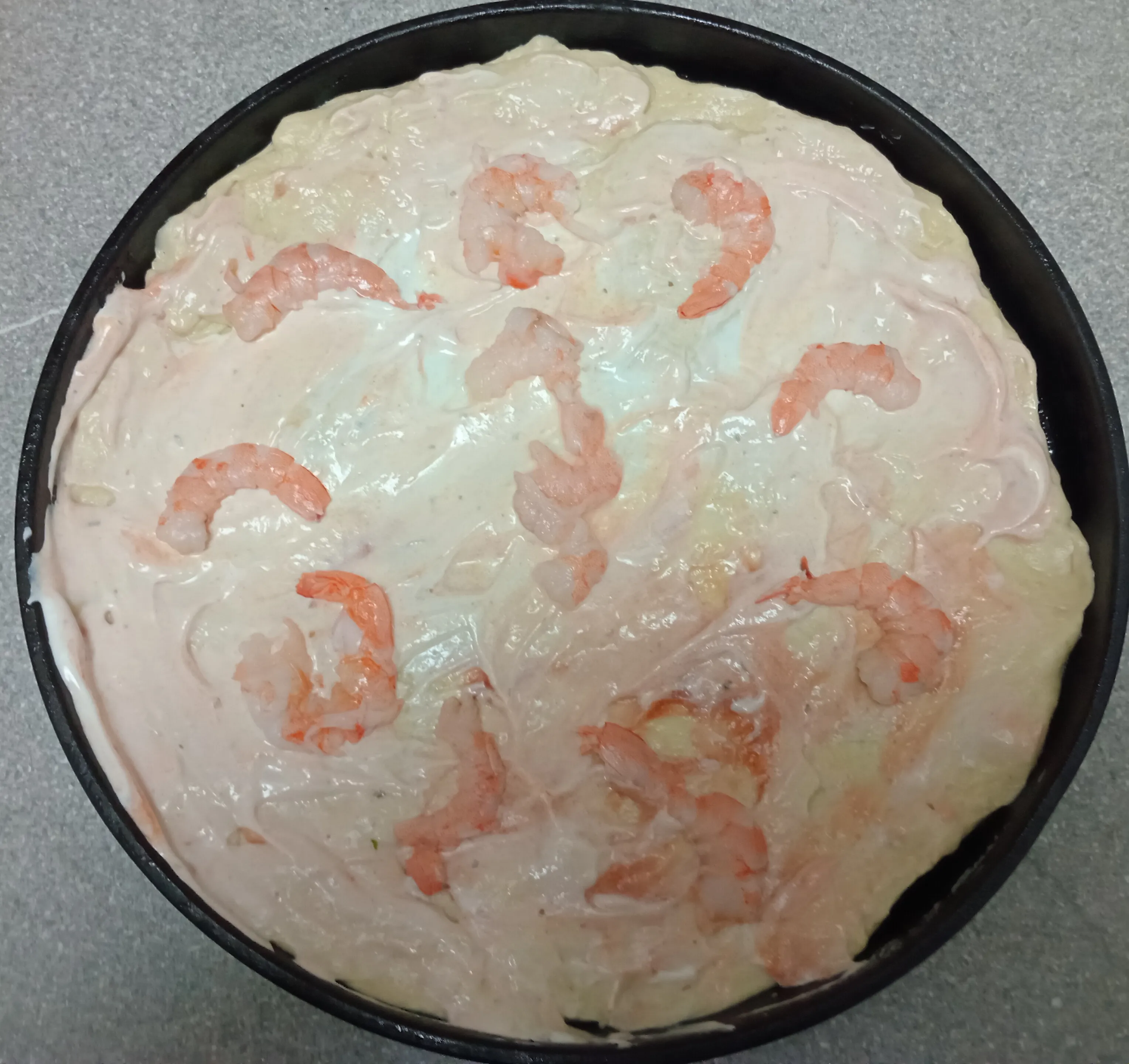 Выложите сверху кетчуп и майонез. Размажьте их по тесту. Выложите сверху очищенные креветки.
