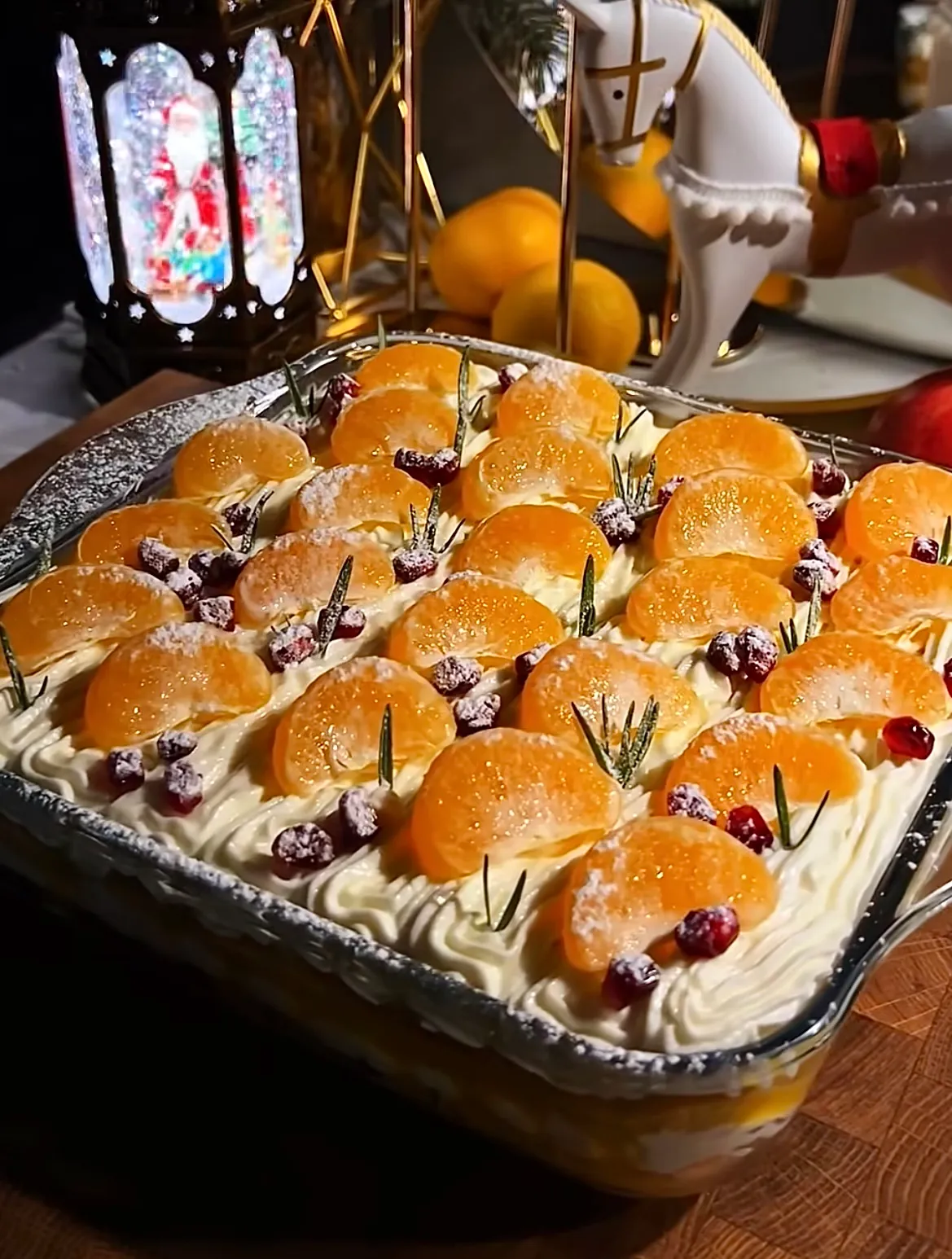 Это зимняя интерпретация классического итальянского десерта, где привычная кофейная глубина уступает место свежести цитрусов. Нежный крем на основе Маскарпоне сочетается с сочными дольками мандарина, создавая лёгкий, освежающий вкус без излишней сладости. Украшение из мандаринов, зёрен граната и веточек розмарина делает десерт не только праздничным, но и визуально запоминающимся, словно съедобное новогоднее украшение!