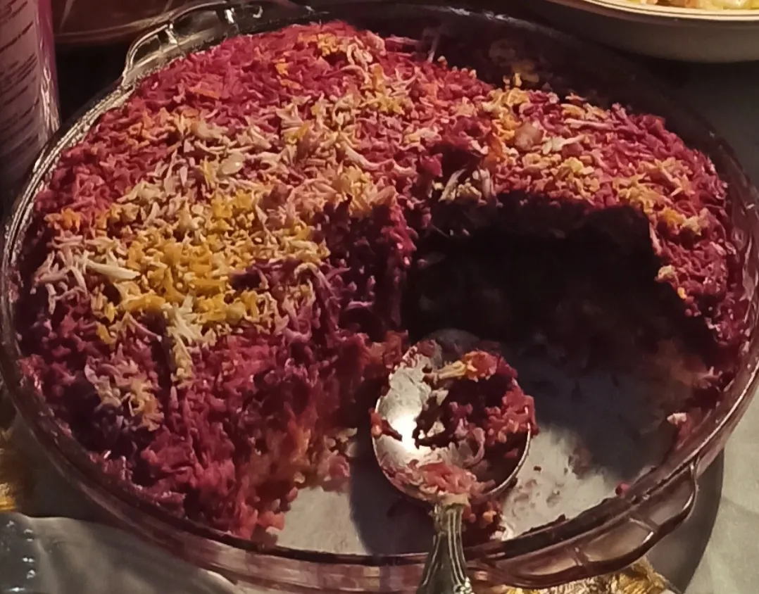 Яйца натрите на тëрке, распределите равномерно поверх свёклы.