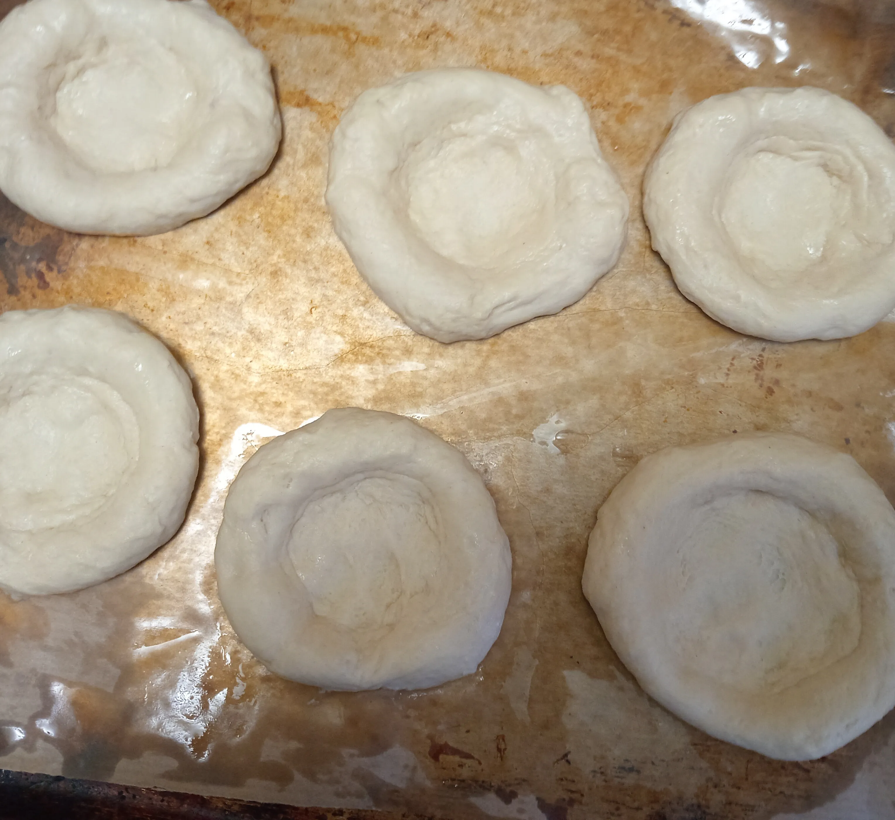 Тесто разделите на шесть частей. Скатайте из теста шарики и выложите на смазанный растительным маслом противень. Сделайте в середине шариков углубления стаканом.