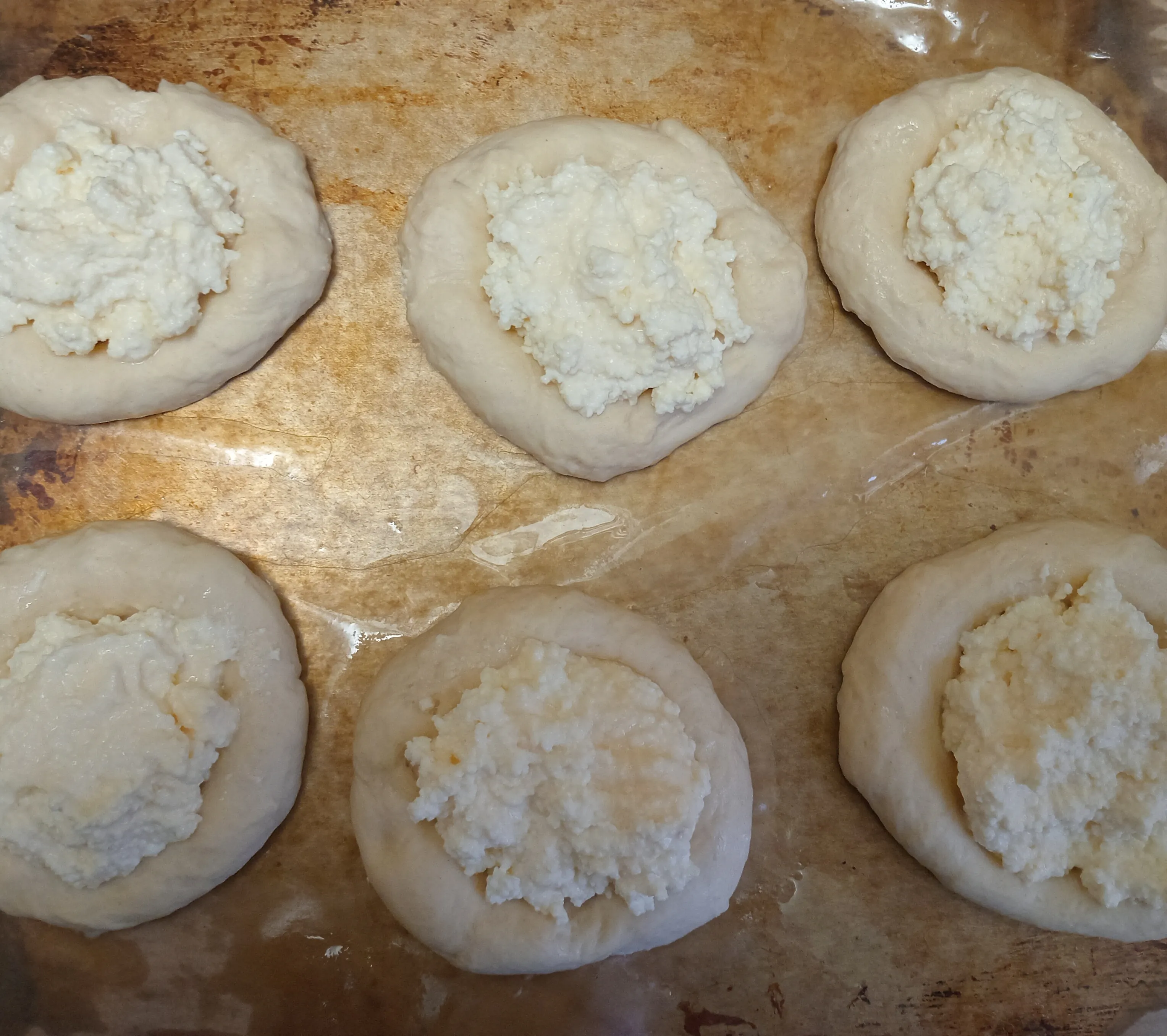 Разложите начинку на тесто и оставьте ватрушки в тёплом месте на 15 минут.