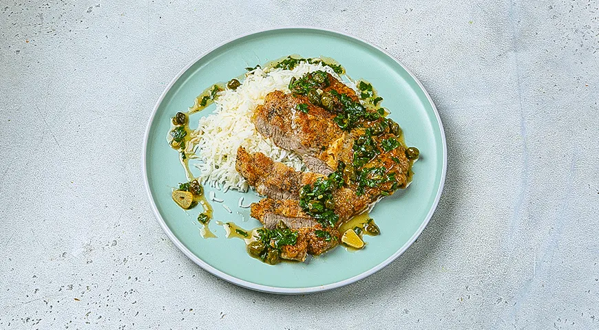 Такие отбивные принято подавать с зеленым салатом и с дольками лимона.