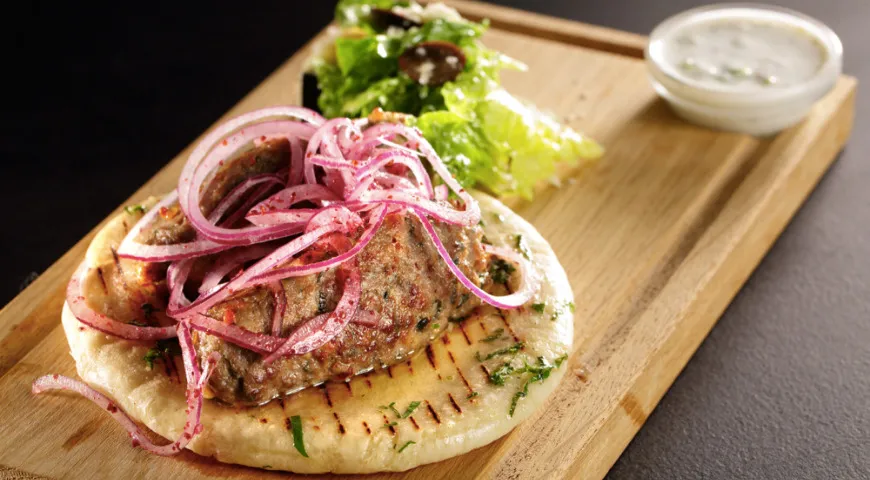 Греческий кебаб отличается нежным вкусом, потому что к говяжьему фаршу добавляется куриный. А главный секрет успеха заключается в том, насколько хорошо вы этот фарш вымесили и отбили.
