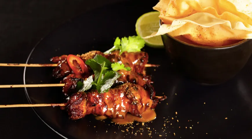 Индонезийский кебаб приготовлен как на Бали: пропитан лаймом и имбирем, посыпан обжаренной кокосовой стружкой и подается под соусом из арахисовой пасты.