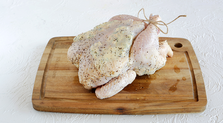 Шаг 3 - Нарежьте застывшее масло кусочками и вложите их цыпленку под кожу, уделив особое внимание грудке. Свяжите цыпленку ножки кулинарным шпагатом или белой толстой нитью. Крылышки заправьте “под мышки”.