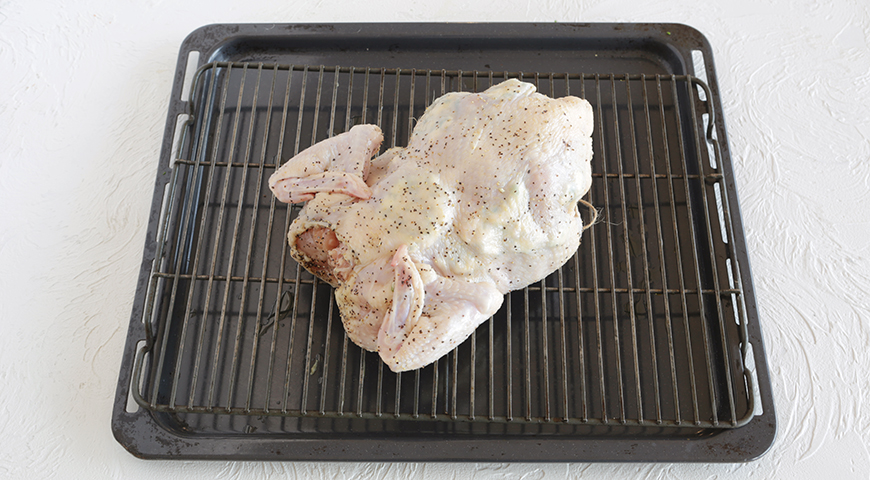 Шаг 5 - Аккуратно переверните цыпленка. Переставьте противень с решеткой в верхнюю часть духовки. Запекайте еще 25 мин., за этой время кожа цыпленка должна стать золотисто-коричневой. Перед разделкой дайте цыпленку полежать на блюде, слегка прикрыв его листом фольги (но не закутывая!), 7–10 мин.
