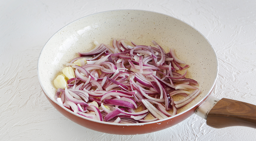 Шаг 2 - Лук нарежьте средними перьями, чеснок раздавите, очистите и измельчите. Обжарьте лук в растительном масле на сильном огне, 2 мин., помешивая.