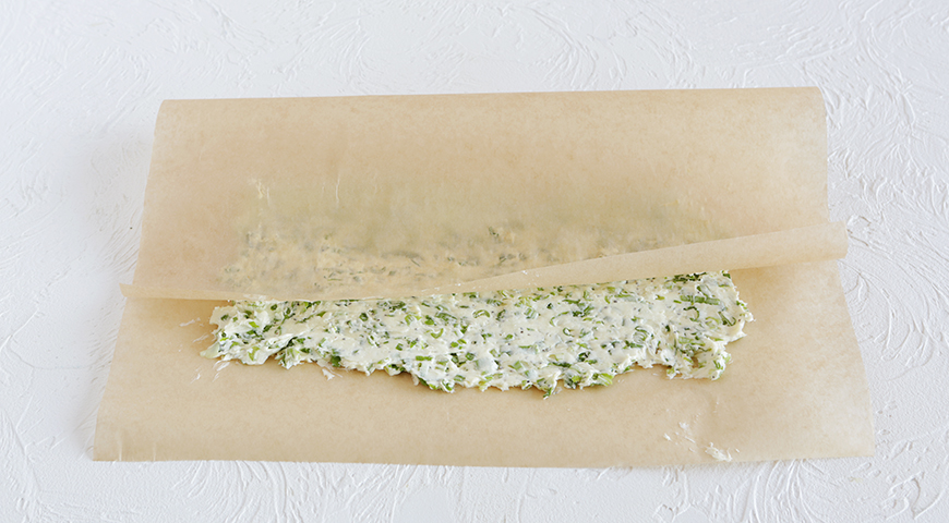 Шаг 1 - Возьмите кусок пергмента примерно 20х30 см. Согните лист пополам по длинной стороне. Намажьте масло с зеленым луком на одну половину пергамента, аккуратно прикройте второй половиной. Положите пергамент с маслом на досочку и поместите в холодильник или морозильник до застывания (в первом случае минимум на 1 ч, во втором – на 15–20 мин).
