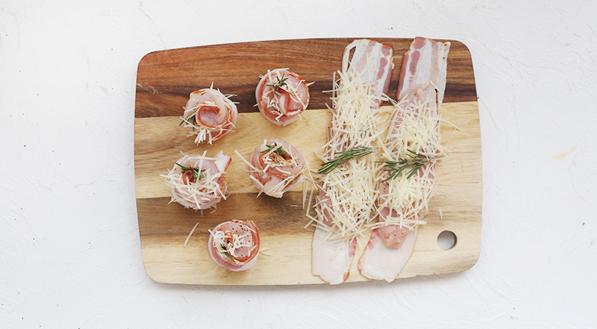 Шаг 3 - Присыпьте тертым пармезаном, поперек положите маленькую веточку розмарина. Аккуратно сверните каждую конструкцию в рулетик и заколите зубочисткой.