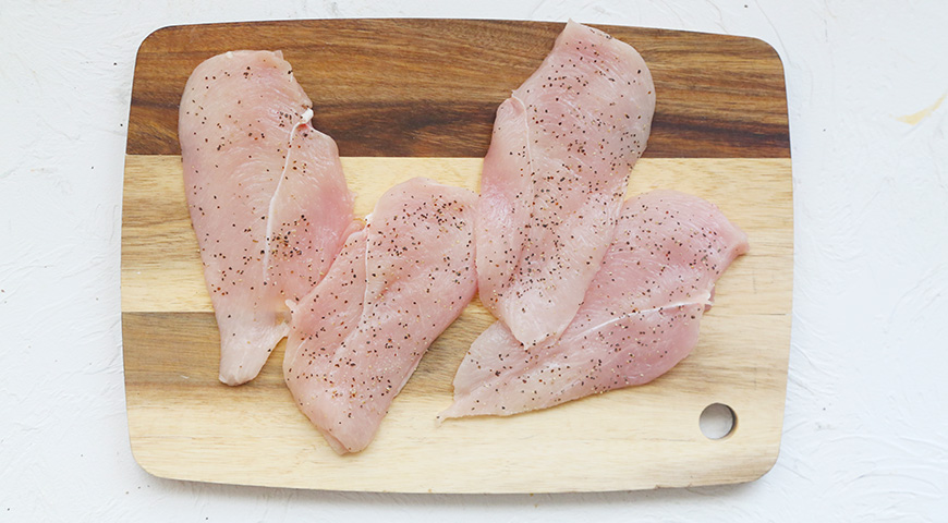 - Разрежьте каждое филе грудки вдоль на 2 плоских куска. Приправьте каждый кусок с обеих сторон солью, перцем и паприкой. Разогрейте духовку до 150°С.