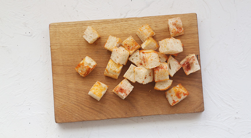 - Нарежьте чиабатту кусочками размером примерно с шарик моцареллы. Сбрызните оливковым маслом, добавьте паприку, чуть-чуть посолите. Дайте маслу немного впитаться, 3–4 мин. Затем обжарьте хлеб на среднем огне в разогретой сухой сковороде со всех сторон до румяной корочки.