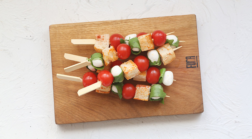 Шаг 2 - Нанизывайте на шпажки сыр, помидоры черри и хлеб вперемежку. Выложите шпажки на блюдо, сбрызните оставшиеся оливковым маслом, поперчите и подавайте.