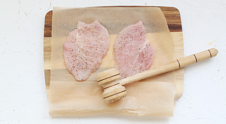 Шаг 1 - Положите на кусок пергамента или пленки, накройте вторым куском пергамента или пленки. Отбейте пласты грудки до толщины примерно 5 мм.