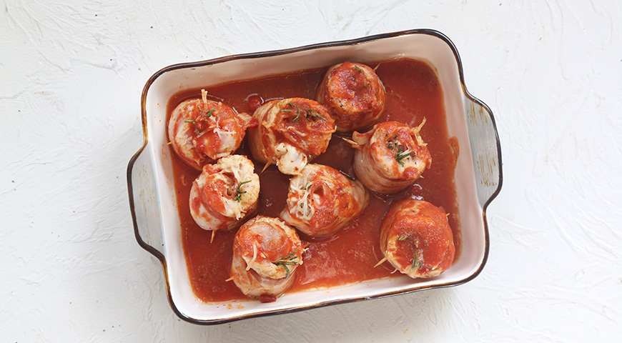 Шаг 4 - Смешайте томатную пасту со 150 мл воды. Разогрейте в большой сковороде смесь растительного и сливочного масла и на среднем огне обжарьте рулетики со всех сторон. Полейте рулетики томатной водой и переставьте сковороду в центр духовки. Запекайте до готовности, примерно 10 мин. Подавайте очень горячими, удалив зубочистки.