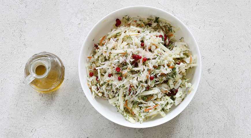 Шаг 2 - Заправьте салат маслом и тщательно перемешайте. Дайте настояться 5–10 мин. и подавайте.