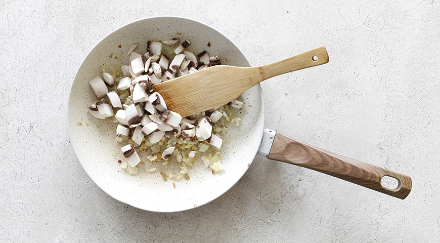 Шаг 1 - Протрите шампиньоны салфеткой и мелко нарежьте (особенно мелко – ножки, они жесткие). Обжарьте шампиньоны в оставшемся масле, чтобы выпарилась вся жидкость. Немного остудите, смешайте с луком и чесноком.