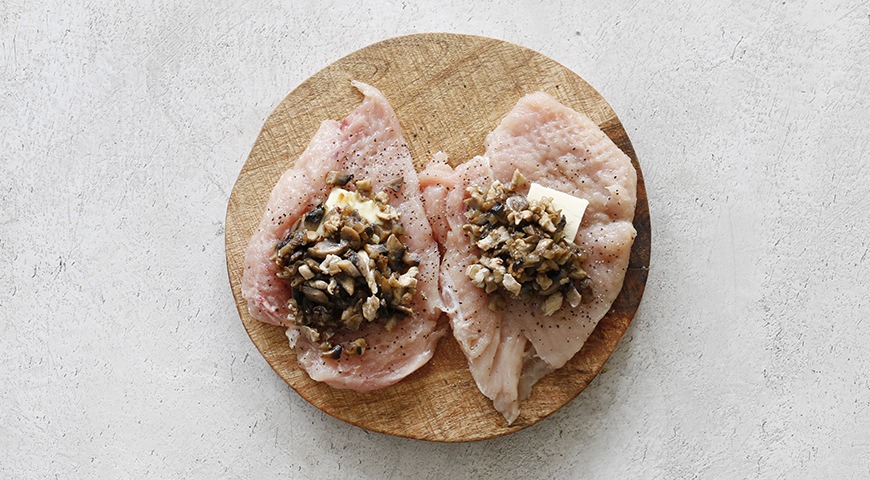 - Отрежьте кусок пищевой пленки примерно 40 х 30 см. Центр смажьте сливочным маслом, уложите куриное филе «кожей» вниз. На него выложите грибную начинку.