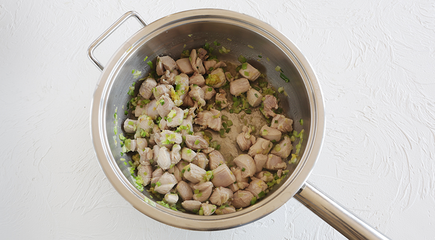 Шаг 1 - Нарежьте индейку кубиками 1 см. Залейте кипящей водой, через 30 сек. слейте воду, обсушите мясо.